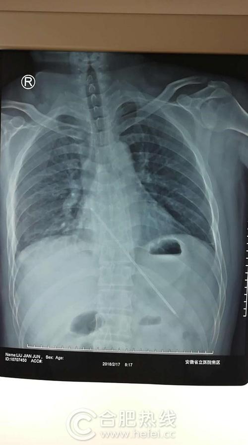 以往因被鸡鸭鱼骨头之类卡住食管来就诊的患者不在少数,但这位患者却有点特殊:他一个月前生吞了一根金属长针,这几天伴随着胸背部和上腹部出现的剧烈疼痛,在合肥多家医院辗转就医,均未被收治,抱着一丝希望来到了中国科大附一院(安徽省立医院)南区。