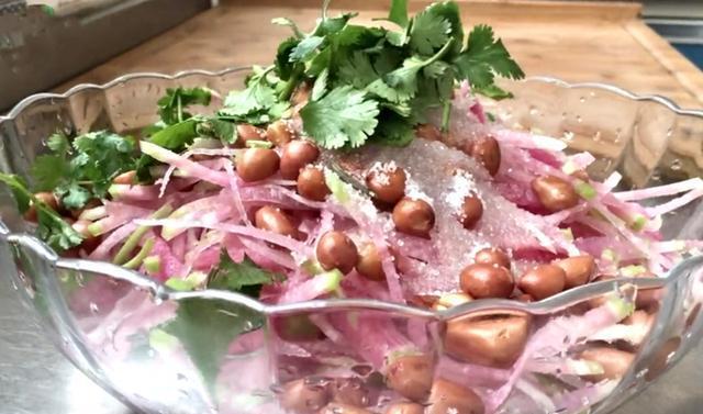 心里美萝卜首先把萝卜的外皮削掉,将萝卜用擦板擦成丝(或者是切成丝),放在清水中浸泡5分钟再把香菜切成段,花生米提前洗干净,把表面的水分都沥干,然后下油锅翻炒一下,炒到表皮都裂开出锅晾凉备用。