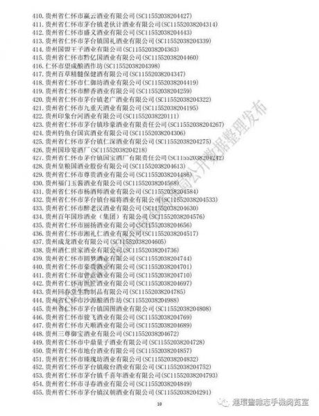 根据国家食品药品监督管理总局公开数据整理,中国酒都·贵州仁怀食品生产许可(SC)获证酒厂名单,截止2019年2月11日,仁怀市共有食品生产许可(SC)获证酒厂506家。截止2019年2月11日,全国共有酒类生产许可证10862张。其中,贵州省拥有酒类生产许可证751张,遵义市拥有酒类生产许可证574张。根据国家食品药品监督管理总局公开数据查询可知:四川省宜宾市拥有酒类生产许可证109张,四川省泸州市,则拥有酒类生产许可证293张。对普通消费者来说,这个“证”(SC)——实现了食品的追溯,满足识别、查询的要求。在购买酒类产品时,消费者可以知道食品原料从哪来、在哪加工、何时产出等。该编号是与企业对应的唯一编码,一经确定便不再改变。食品生产许可证编号为SC+14位阿拉伯数字。