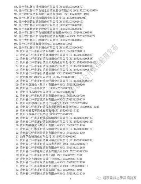 例如,贵州茅台酒股份有限公司的编码为SC11552038220099,115代表食品编码“酒类”,52 代表贵州省, 03 代表遵义市, 82 代表仁怀市。贵州茅台酒股份有限公司生产许可证号SC11552038220099,说明该公司的产品生产于贵州省仁怀市。