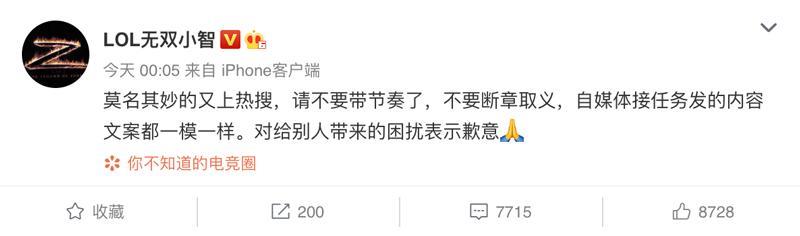 看到舆论发酵的越来越离谱,今天小智也是赶忙在微博中发声解释,小智表示“自己又莫名其妙上热搜了,请有些人不要乱带节奏断章取义了,现在自媒体接任务发的内容文案都一模一样,这次事件自己对给别人带来的困扰表示歉意。”