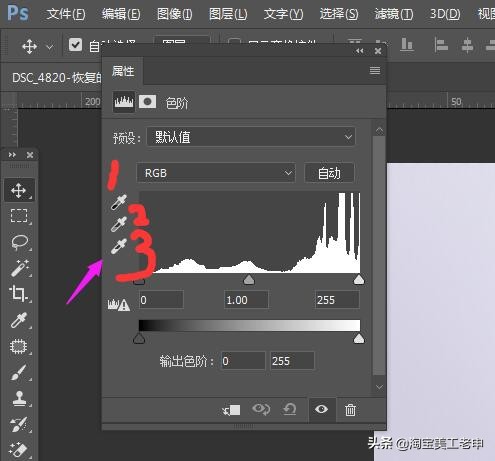 第二步:如下图所示,标了1、2、3的,像注射器样的图标,分别对应的是图中的黑场、中间灰、白场,粗暴的理解就是。当我们点一下1这个图标再点击图片灰色背景的时候,与它相近相同的区域就变成黑色了。因此,我们呆需要选择“3”,然后点击图片灰色背景,图片就会立即变成白色了的。