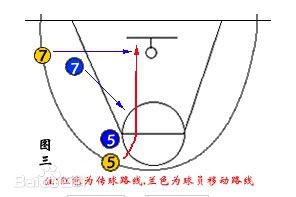 进攻球员⑤持球向右边突破时,如防守球员⑦向前封堵进攻球员⑤的路线时,进攻球员⑦没有球员防守时,马上切入篮下,进攻球员⑤将球传给进攻球员④执行上篮。