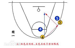 进攻球员④将球传给进攻球员⑤后,立即摆脱防守球员④的防守切入篮下,进攻球员⑤接球后需摆出进攻的姿态,吸引防守球员,当进攻球员④切入篮下时,立即将球传给进攻球员④,进攻球员④接球后进行上篮。