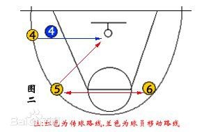进攻球员⑤与进攻球员⑥相互传球吸引防守球员的注意力,进攻球员④择机摆脱防守球员切入篮下,接外围球员的传球,接球后上篮。