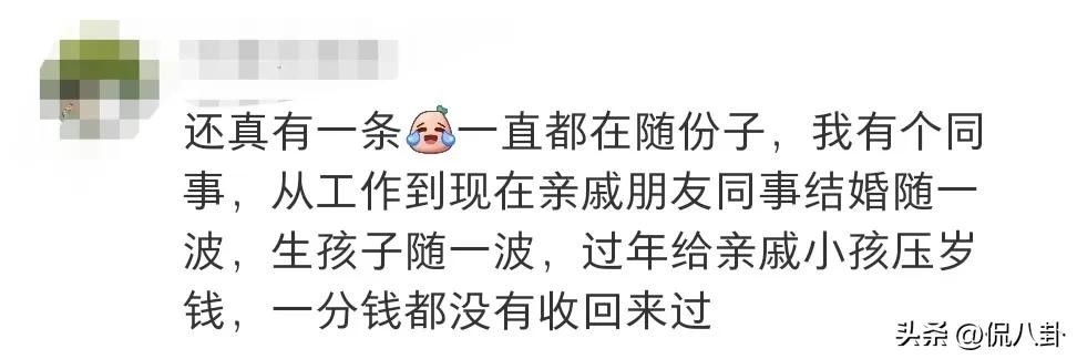 还真有一条后一直都在随份子,我有个同事,从工作到现在亲戚朋友同事结婚随一波,生孩子随一波,过年给亲戚小孩压岁钱,一分钱都没有收回来过