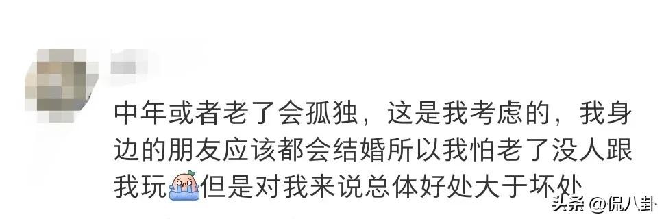 中年或者老了会孤独,这是我考虑的,我身边的朋友应该都会结婚所以我怕老了没人跟我玩但是对我来说总体好处大于坏处