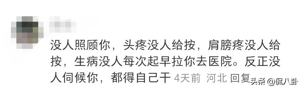 没人照顾你,头疼没人给按,肩膀疼没人给按,生病没人每次起早拉你去医院。反正没人伺候你,都得自己干