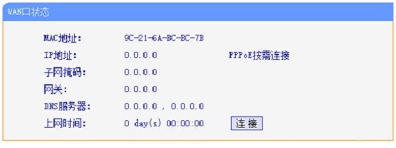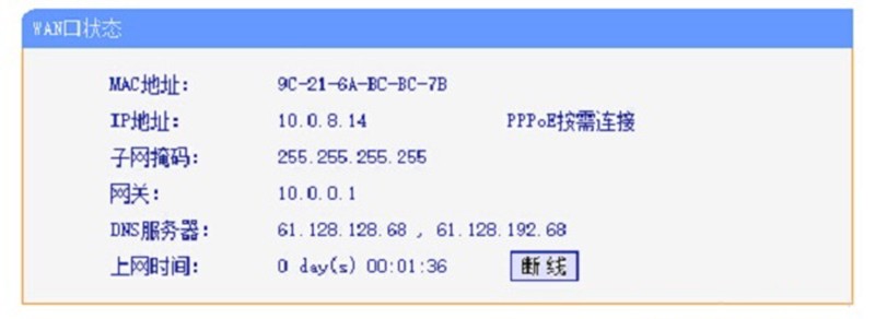 从上图中,我们看到在WAN口状态选项下,有“MAC地址”、“IP地址”、“子网掩码”、“网关”、“DNS服务器”、“上网时间”6个选项。