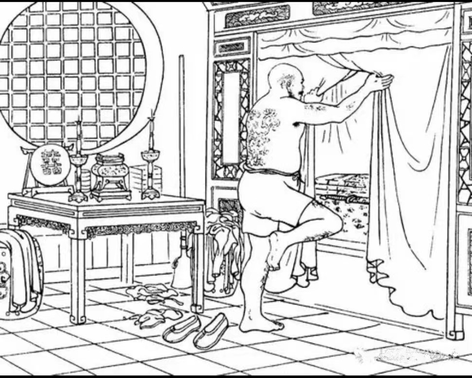 鲁智深桃花村教训小霸王周通时,脱得赤条条地伴做新娘躺在床上,待到周通来了后,他一丝不挂地骑在周通身上打,这画面更是不堪入目。