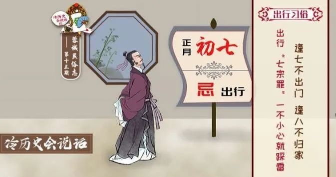 在古代有7不出门的习惯,因为,古人认为初七出门,必然不顺利。因为“七”的外形和匕首的“匕”有点近似,而匕首是凶器,主凶 ,因此,人为七出门的话主凶,意味着出门不顺利,甚至会出现很多变故,凶多吉少。因此,农村有七不出门的说法就是这样来的。