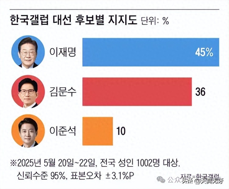 韩国盖洛普于20日至22日对全国1002名成年人实施了“总统候选人支持率”调查(无线电话采访),结果显示,民主党候选人李在明的支持率为45%,国民力量党候选人金文洙的支持率为36%,改革新党候选人李俊锡的支持率为10%。