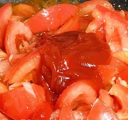 5、加两大勺番茄酱,均匀上色入味。