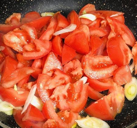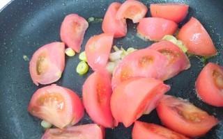 另起锅,把葱和姜爆香,加入西红柿翻炒一分钟