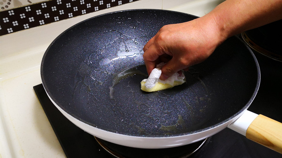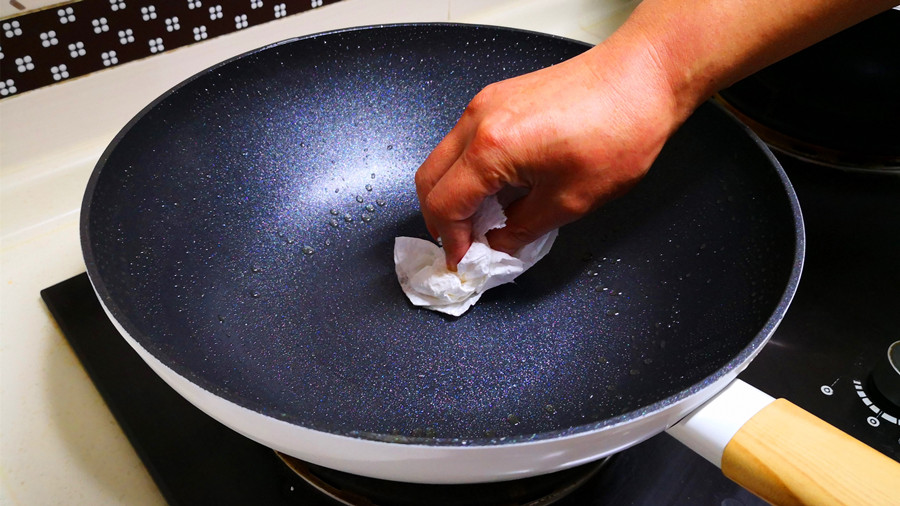 3、然后擦干后再次倒入适量的食用油,开小火慢慢加热,一边加热一边继续用厨房纸擦拭,这样油就会和锅发生氧化反应,形成一层保护膜,可以隔绝空气和水分,从而使不粘锅使用得更长久,而且一直保持不粘的状态。
