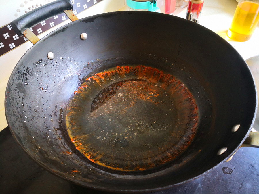 3、清洗干净后再次大火加热,铁锅烧至快冒烟的时候,倒入少许食用油,同时不断晃动锅底,保证锅内部每个地方都能浸润到食用油,等到锅中食用油开始冒烟,我们把油倒掉,将锅内的油脂和表面的杂质完全清洗干净。然后再次用相同的步骤做润锅处理,这样的步骤至少要重复三四次,整个润锅过程才算完成了,处理好的铁锅至少放一个晚上再使用。