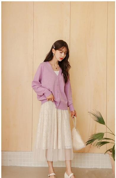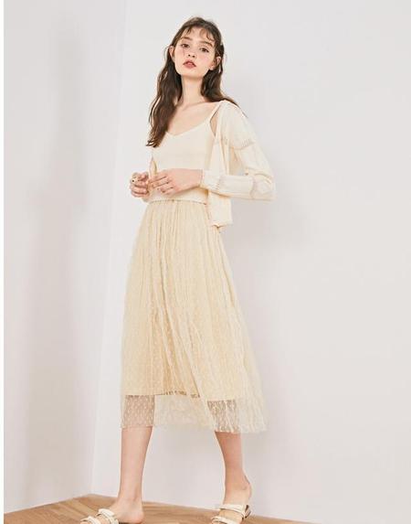 蕾丝长裙与生俱来就有甜美感,内搭一件小吊带凸现性感的锁骨增添了一份浓浓的女人味。外搭针织衫小外套圆形的纽扣设计,方便穿脱。可爱浪漫的波浪边袖口,少女心满满。这身搭配从里到内,从上到下层次感分明,视觉效果非常棒,回头率也是杠杠的。