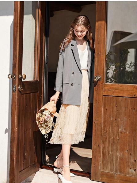 宽松挺括的小西装,不挑身材轻松游走在休闲与帅气风格之间。小西装的干练帅气遇上蕾丝长裙甜美浪漫,两种不同材质之前的相互碰撞,独具特色亮点十足。非常有范的一身搭配,走路都带风太潇洒。