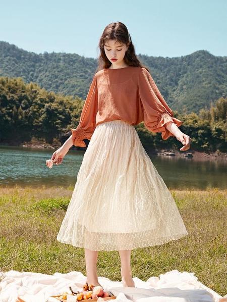 2.蕾丝网纱长裙+泡泡袖雪纺衫