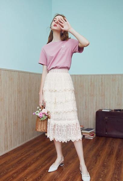 自带仙气的蛋糕蕾丝长裙,穿上它秒秒变成小仙女!层层叠叠的蛋糕裙搭配粉色的趣味的T恤衫,减龄效果满分少女感十足。