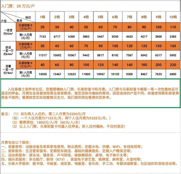 上面这张表格即为入住其养老院所需收取的赞助费,我们可以看到,它是分不同的签约年限的。比如说,签约三年期,就可以入住他们养老院三年的时长,需首先缴纳6.8万的赞助费。入住之后再按月缴纳月费。月费收费标准如下图: