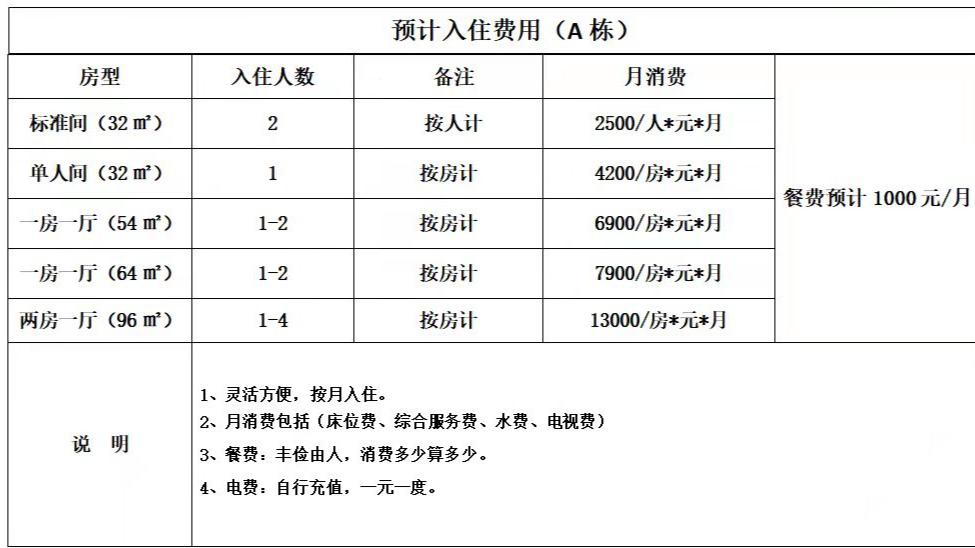 如上图所示,其入住后每月所需费用由3大项组成,月消费(床位费为主)+餐费+护理费(以评估为准)。自理型老人住一个标准双人间的床位,月费大概在4千多块钱一个月;护理型老人住一个标准双人间的床位,月费大概在6千左右一个月。