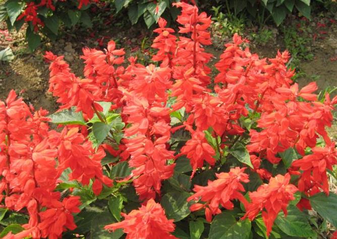 这是一串红新品种,定型于2006年。它的样子就像一串串鞭炮,常作为观赏的主体花卉,用来布置大型花坛,正是,万绿之中一点红。
