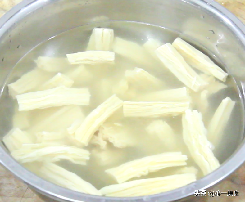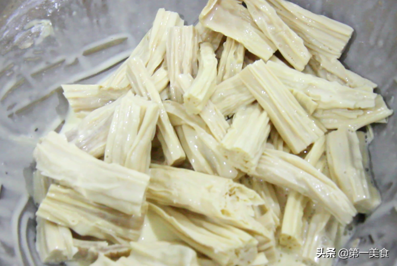 很多人做腐竹到最后里外软硬程度不一,其实是因为第一步做错了,泡腐竹时不能用热水,用温水和凉水都可以。