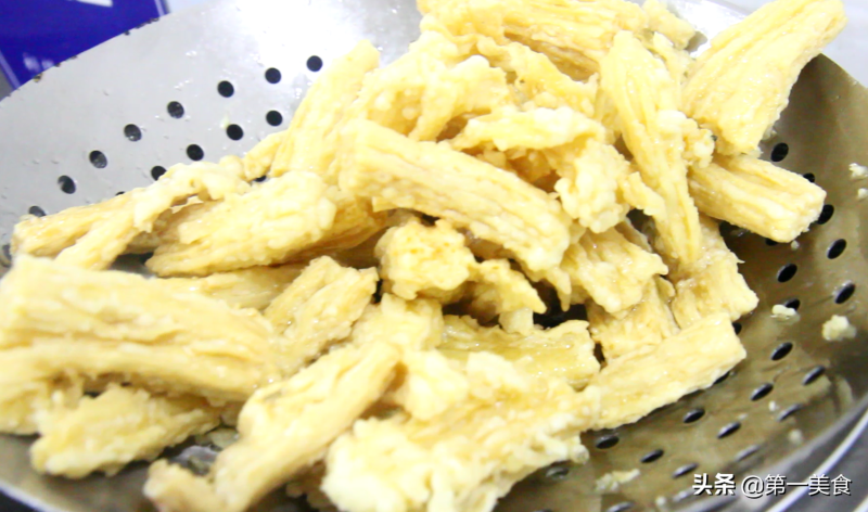 同时捞出比较小的淀粉疙瘩,持续搅动腐竹炸成金黄色外表变硬起泡,就可以出锅控油了。