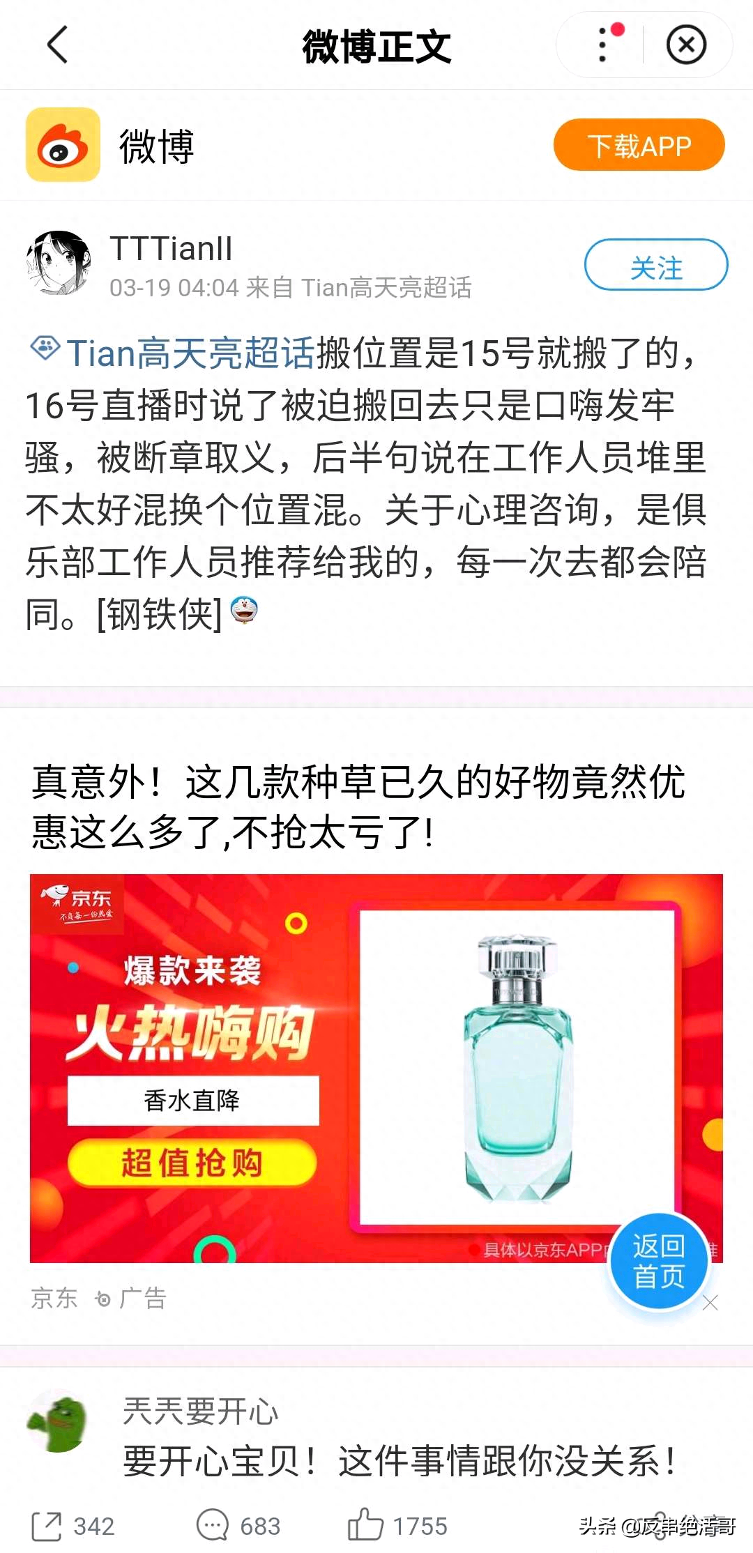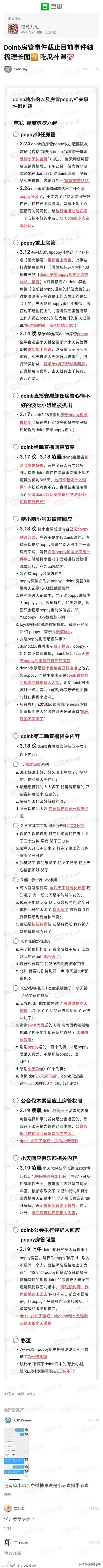 抗蛆和看点也就会偷梗,真要整理资料还是得看豆瓣的小姐姐们,真要骂人还是得看微博的小姐姐们。豆瓣网友整理了中野恩断义绝2.0始末。2月24日Doinb的房管Poppy卸任房管,26日Doinb空降超话安慰粉丝,3月12日Poppy重新当上房管,3月14晚某网友开始以此事进行转发抽奖,3月17日事件发酵,Doinb安慰Poppy的视频被扒出,晚上Doinb正式回应节奏,有节奏是好事,说明现在有热度,弹幕让唐小幽道歉的统一365天,18日凌晨5点Doinb空降超话安慰粉丝(这真时间管理大师,这时间谁也叫不醒我),18日晚上唐小幽微博回应事件。在18日晚上直播的时候节奏更大的一个重要原因就是Doinb对这次事件的不以为然,在念礼物的时候说你这ID我不能念,金咕咕是小天爸爸我受不了,要被冲烂了。感谢小天7W的飞机,感谢小天的飞机(ID为小天对不起),而小天就坐在他旁边。3月19日凌晨伐木累运营出来背锅,19日凌晨小天出来说搬回去是在15号。3月19日上午Doinb经纪人出来背锅。后来唐小幽给FPX队员点奶茶,没有人接受。