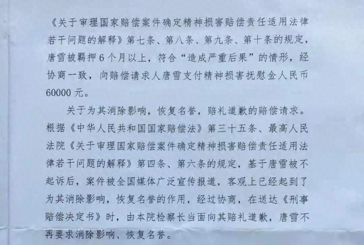 该决定书还认为,基于唐雪被不起诉后,案件被全国媒体广泛宣传报道,客观上已经起到了消除影响、恢复名誉的作用,经协议由检察长当面赔礼道歉方式,唐雪不再要求消除影响、恢复名誉。