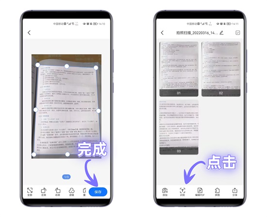 将纸质文稿拍下后进行裁剪,还能添加滤镜,再点击「保存」,照片就变成了PDF电子档,点击「识别」按钮,还可以提取文字。