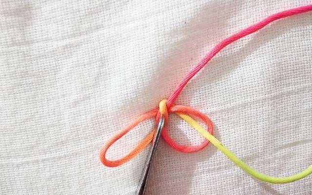6.黄色的线又往下从后面绕到前面来,穿进上面的洞里