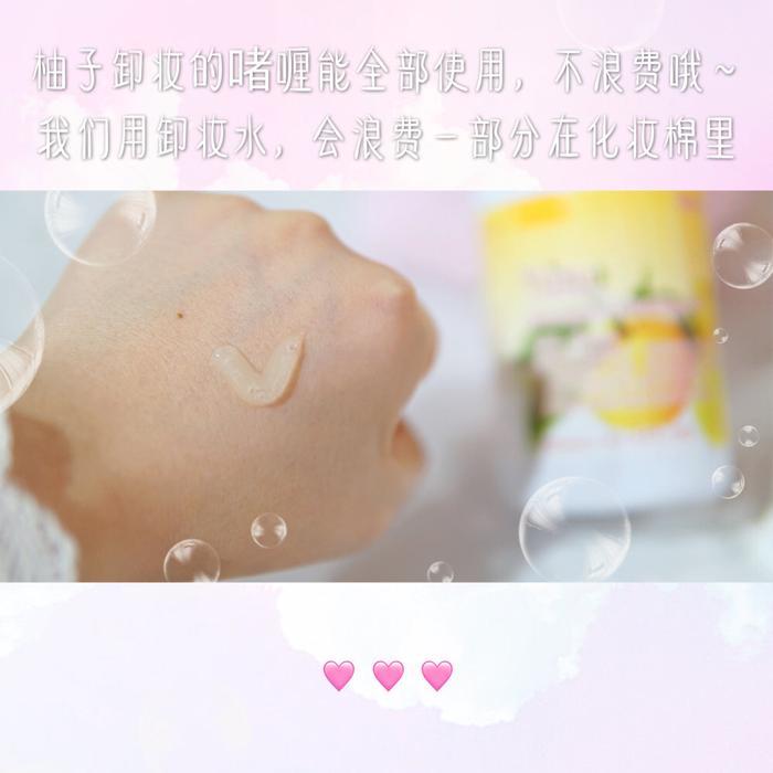 每每用Nursery娜斯丽柚子卸妆,都忍不住想要吃柚子!它的香味非常喜欢呀,甜甜的很天然的柚子香味,没有人工香料、人工色素,十几种天然水果植物精华萃取。 柚子卸妆是啫喱状的,干手干脸打圈按摩后用温水冲洗就OK了,也不需要再二次清洁,真的很省事,最主要是还卸得很干净。不像我们平时用卸妆水都是使用化妆棉在脸上反复擦拭,有时候卸不干净要擦好几遍,费时又费力。 它的卸妆力也很不错,曾多次获得日本COSME大赏卸妆力1名呢!同时添加了很多护肤成分,温和卸妆的同时也能做到保湿、护肤的功效,不愧是在全国都刮起一阵大风的柚子卸妆!,也是非常喜欢了!