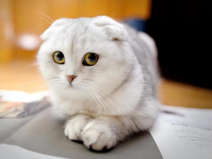 苏格兰猫脑袋圆圆的,眼睛炯炯有神,向前折叠的耳朵紧紧扣着圆圆的脑袋,让它更加甜美、可爱。
