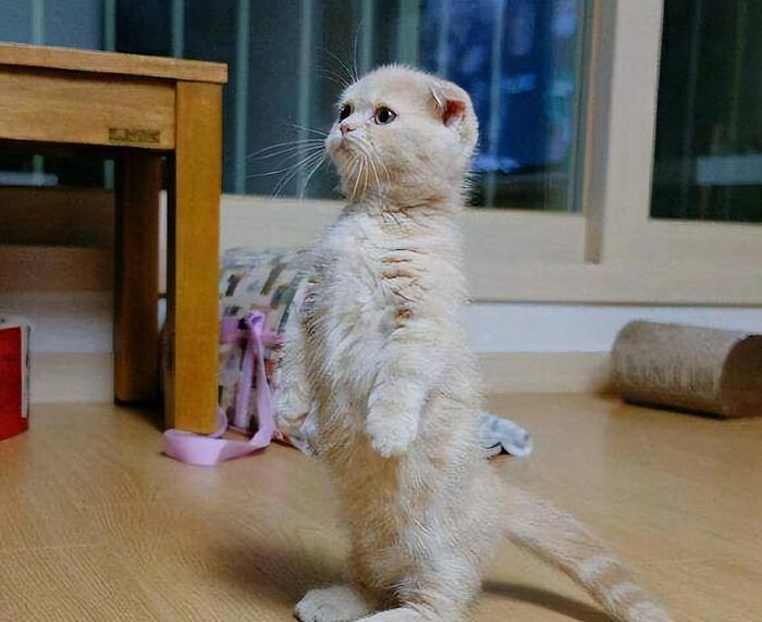 苏格兰折耳猫在软骨部份有一个折,使耳朵向前屈折,并指向头的前方,非常可爱,但也正因如此,这种猫患有先天骨科疾病,发病的时候,经常用站立的姿势来缓解痛苦。