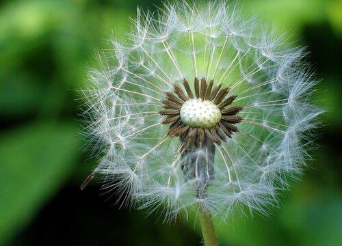 蒲公英的花朵看上去就像一个白色的小毛球一样,风一吹,种子随着绒毛四处飘散。