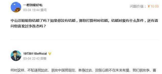 2007年,中山忍为了中国的粉丝开通了微博,在一次粉丝问及和李连杰的情感时。