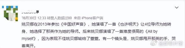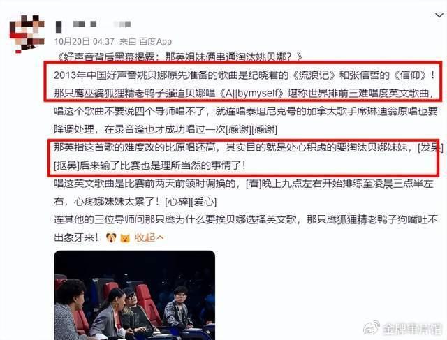 也有人开始为姚贝娜鸣不平,说那英公报私仇让姚贝娜唱难度过于高的歌曲,导致她输给了另一位名不见经传的选手,哭着离开舞台。