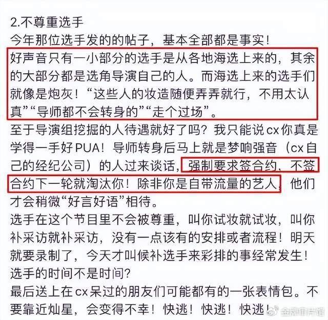 Coco李玟去世众人惋惜,一段生前录音爆出她曾被《中国好声音》节目组欺负,一代巨星竟遭受如此对待,《好声音》自然是被骂上了热搜,并被扒出除了欺负Coco以外的其他恶行:不尊重选手、转身全是剧本等。