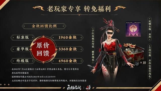 当然在这次付费模式转变的过程中,老玩家倒是也有一些安慰奖,宁红夜红装【耀世魂花】、定制头像、十个宝箱,还有对应购买版本定价的金块,奖励说得过去,算是补了价值大几百点券的东西。
