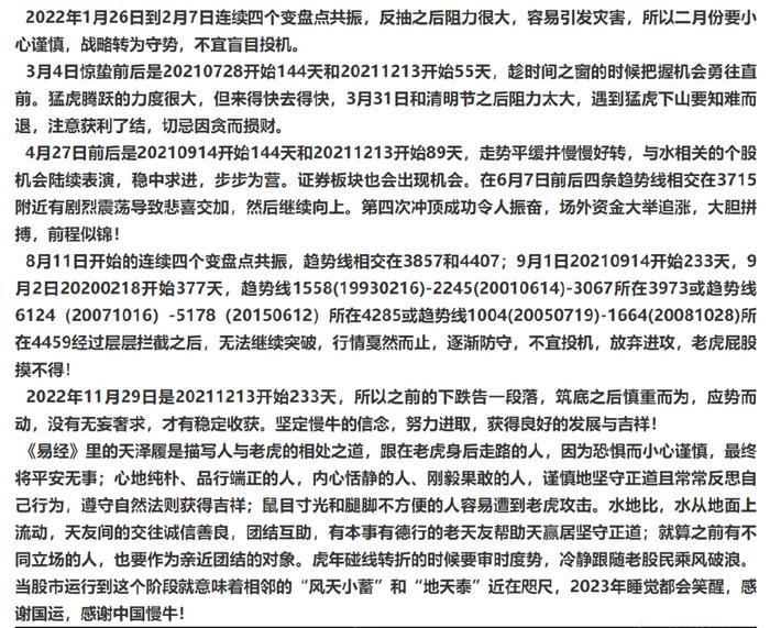 1月4日,他在文章《属水的板块大涨特涨》中写道:“日线虽然不好看,但毕竟在均线密集区之上,周线、月线也在均线上方,趋势方面是在逐步走出底部区域的状态当中。底部结构成型后趋势就将向上发散,春季行情的第三浪上涨周期正在加载当中,第四次冲击大横盘箱顶趋势线的时间不远了。持股享受春季行情的红利。”