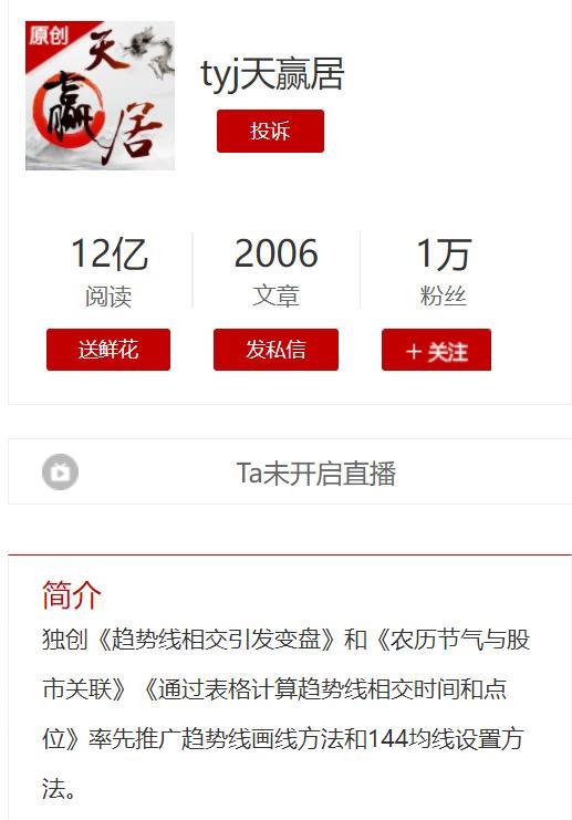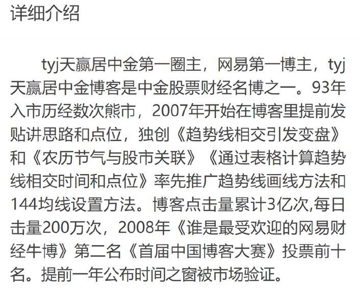“tyj天赢居”个人简介显示,他出生于1973年,20岁(1993年)开始炒股,在遭受股市毒打后,2006年形成自己独立的炒股体系,2007年开始在博客发布文章。他的文章主要是以技术分析为基础,对股市进行预测。