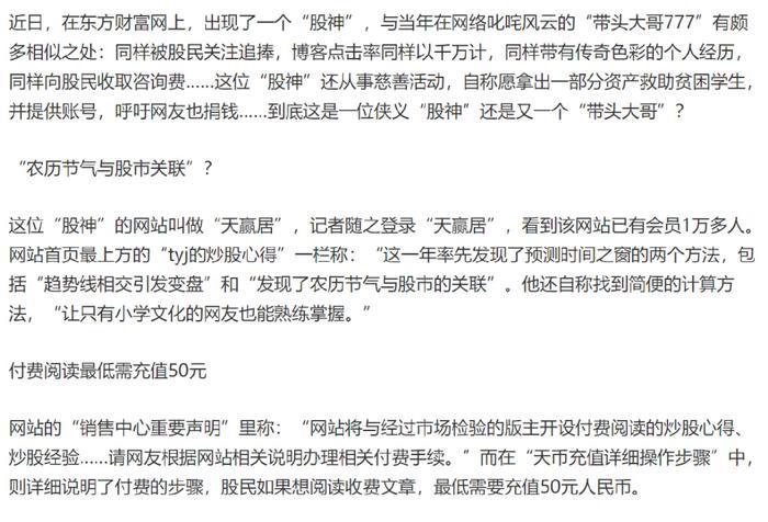 青出于蓝而胜于蓝。“tyj天赢居”势头比带头大哥更猛,他在新浪、网易、东方财富网、中金等主要财经网站都开设博客。当年,东方财富网的点击数甚至超过2000万,即使每篇文章还要付费阅读,但粉丝还是积极掏钱。有媒体对此进行了报道: