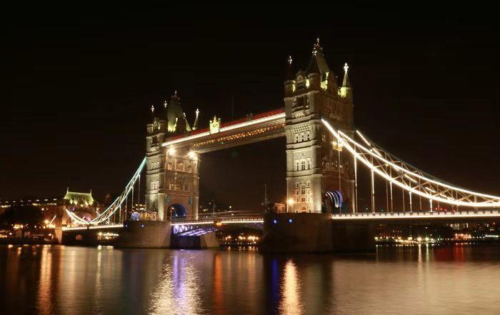 夜晚的塔桥美得让人心醉,由于整个桥面上都挂满了装饰的彩灯。所以天黑以后,桥体显得非常耀眼。明亮的灯光映照在水面上,将整个夜空照亮了。伦敦的建筑风格很有趣,整个城市的高层建筑不会扎堆而建。所以塔桥是附近范围内最高的建筑,尤其是在夜晚的时候,在灯光的映衬下,塔桥显得非常雄伟。