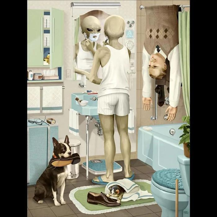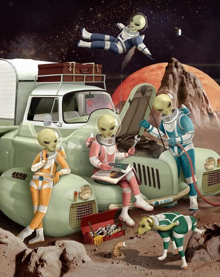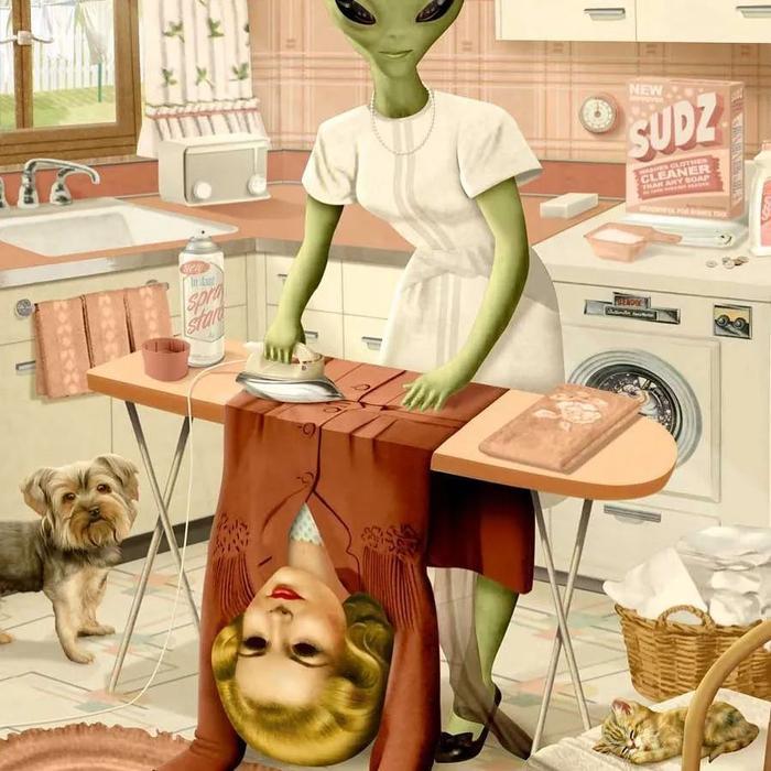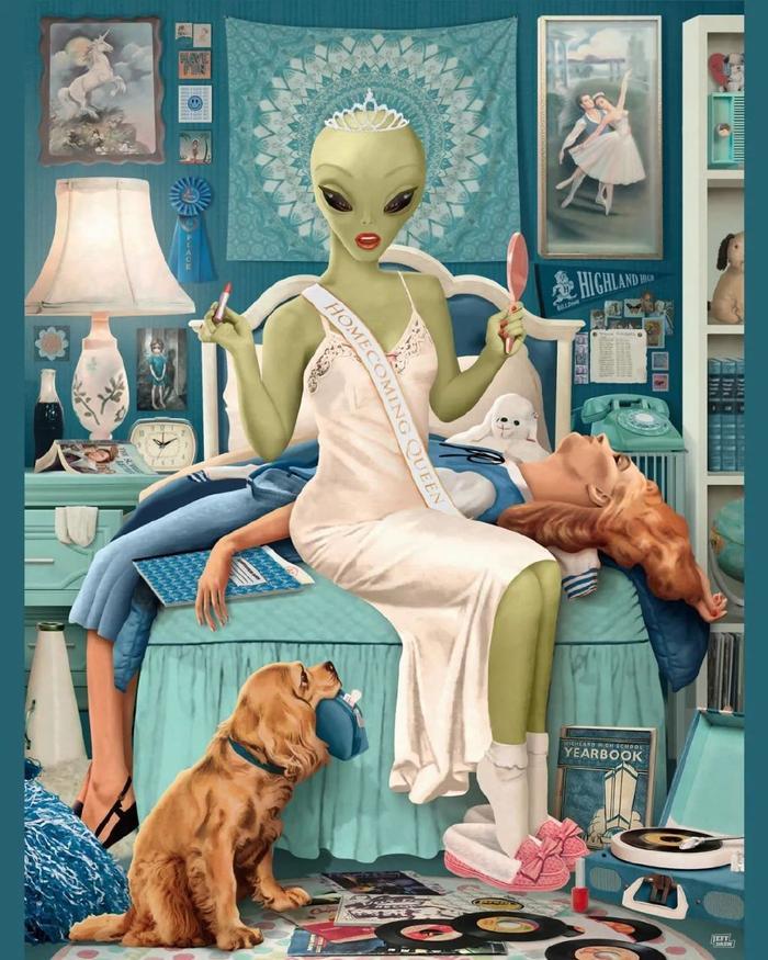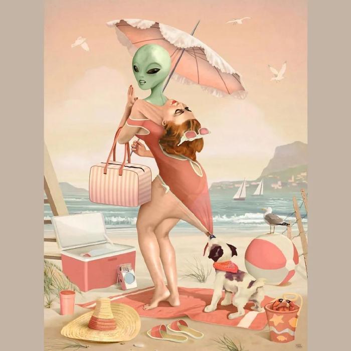 这位插画家作品的最特别之处,以及广受赞誉的最大原因,在于令人感到眼花缭乱的视觉风格。受上世纪50年代旧广告、旧海报以及各种图形的影响,杰夫·德鲁从中汲取灵感,来创作讽刺当下的插画作品。作品中充满了不和谐的元素,以及看似不应该同时出现在一个画面中的事物存在,甚至,我们可以在很多的作品中,看到类似外星人的面部特征。