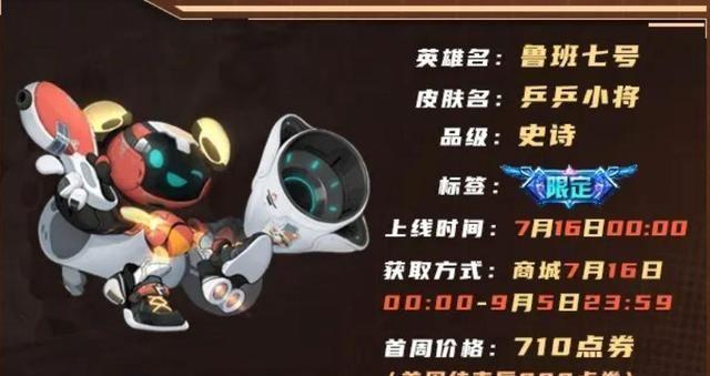 鲁班联动皮肤乒乓小将曝光,660点券拿下限定,电玩小子不香了