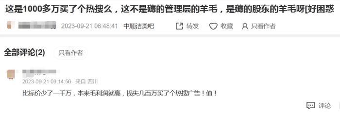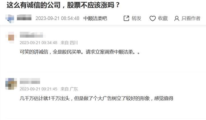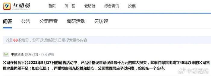股吧截图也有投资者在深交所互动易平台上对中顺洁柔提问:公司在抖音平台2023年9月17日的销售活动中,产品价格设置错误造成千万元的重大损失,此事件曝露出成立45年以来的公司管理水准仍然不足(如此低级),严重损害股东权益和信心,公司管理层应予以问责,给股东一个交待。截至发稿,中顺洁柔并未回复。