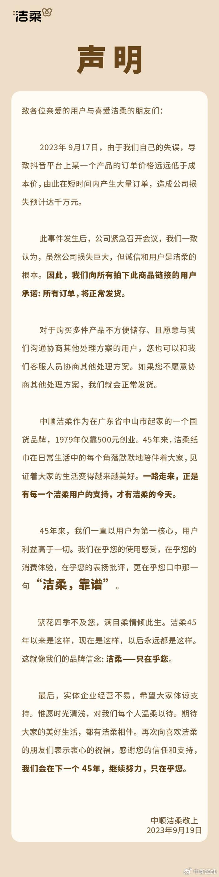 上半年净利近8500万据证券时报报道,9月17日,洁柔在官方直播间推出了一款原价56.9元1箱的纸巾,但由于员工操作失误,将价格误设置为了10元6箱,引发了大量用户的抢购热潮。9月19日午间,微信号“洁柔官方福利社”发布声明称,9月17日,由于自己的失误,导致抖音平台上某一个产品的订单价格远远低于成本价,由此在短时间内产生大量订单,造成公司损失预计达千万元。声明称,所有订单,将正常发货。不过,声明中也提到,对于购买多件产品不方便储存、且愿意沟通协商其他处理方案的用户,可以和客服人员协商其他处理方案。如果不愿意协商其他处理方案,就会正常发货。