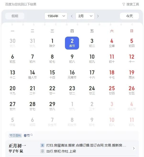 里面有个例子,1984年2月2日0时起到1985年2月19日24时截止为农历鼠年。我翻了一下日历。很明确1984年鼠年是从农历正月初一开始到腊月三十儿。